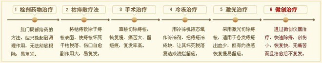 1、枯痔散療法:將枯痔散涂于痔核表面,使痔核壞逝世、干枯脫落、傷口自愈,該法實用于Ⅲ期內痔及嵌頓痔。